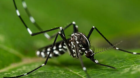 De Aziatische tijgermug is een kleine, zwarte mug met een opvallend wit streepje over de rug en witte streepjes op de poten. Deze exotische mug kan tropische ziektes overdragen, wat een risico vormt voor de gezondheid.